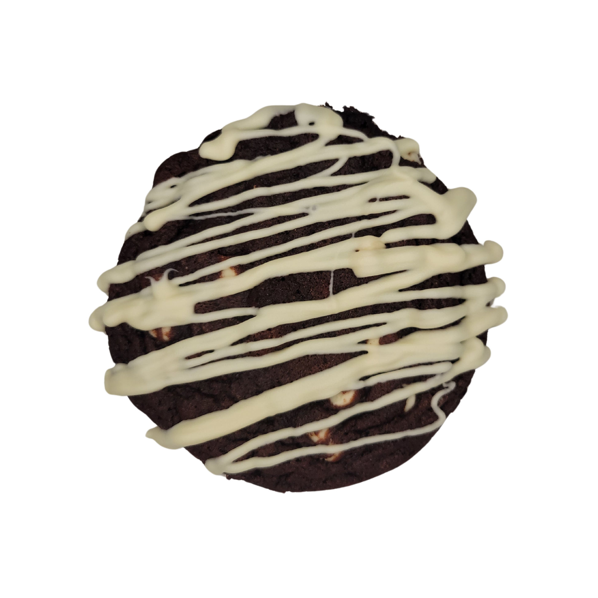 Red velvet cake tasting cookie with white chocolate chips and topped with white chocolate drizzle.